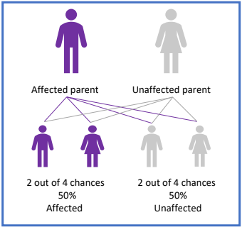 Usually, a person only needs one faulty copy of any of the genes associated with MND to lead to an increased chance of the disease developing. People with a parent who carries an MND gene have a 50% chance of inheriting the same gene fault. This is known as autosomal dominant inheritance; in other words, when one parent carries the autosomal dominant faulty gene copy.